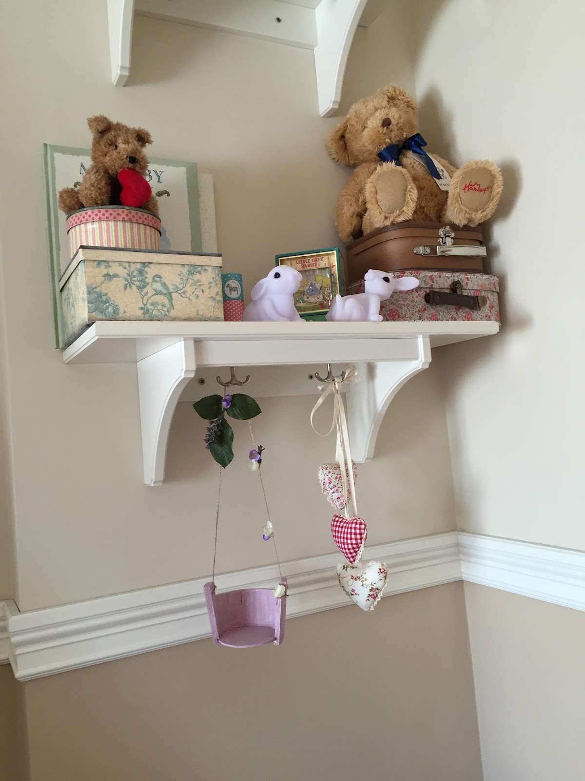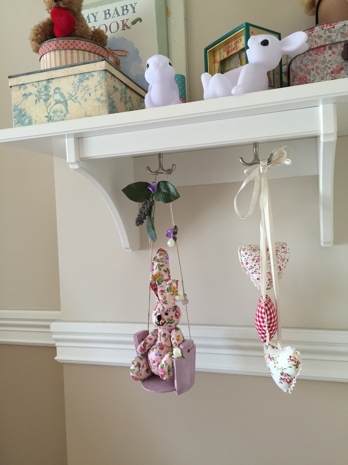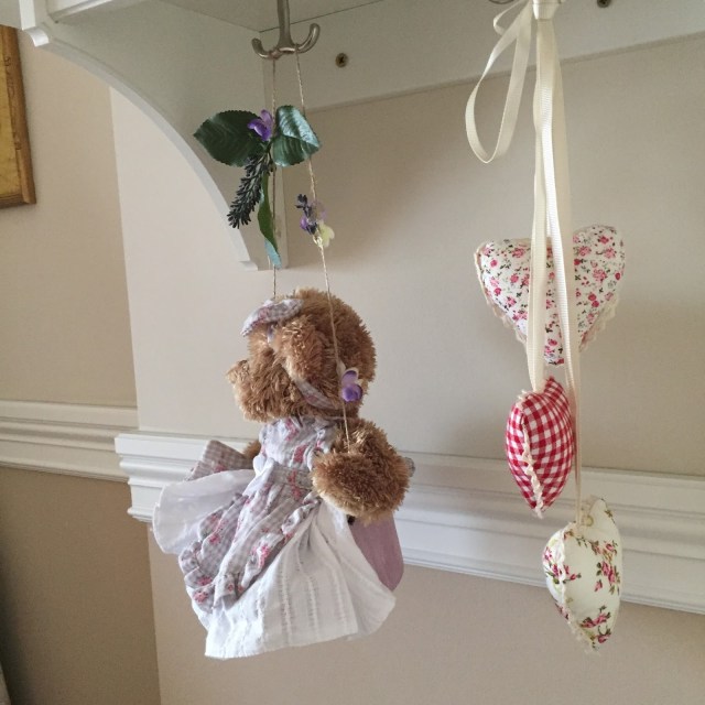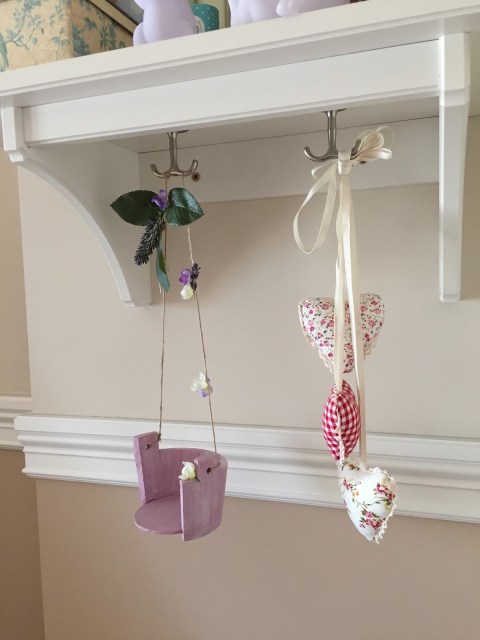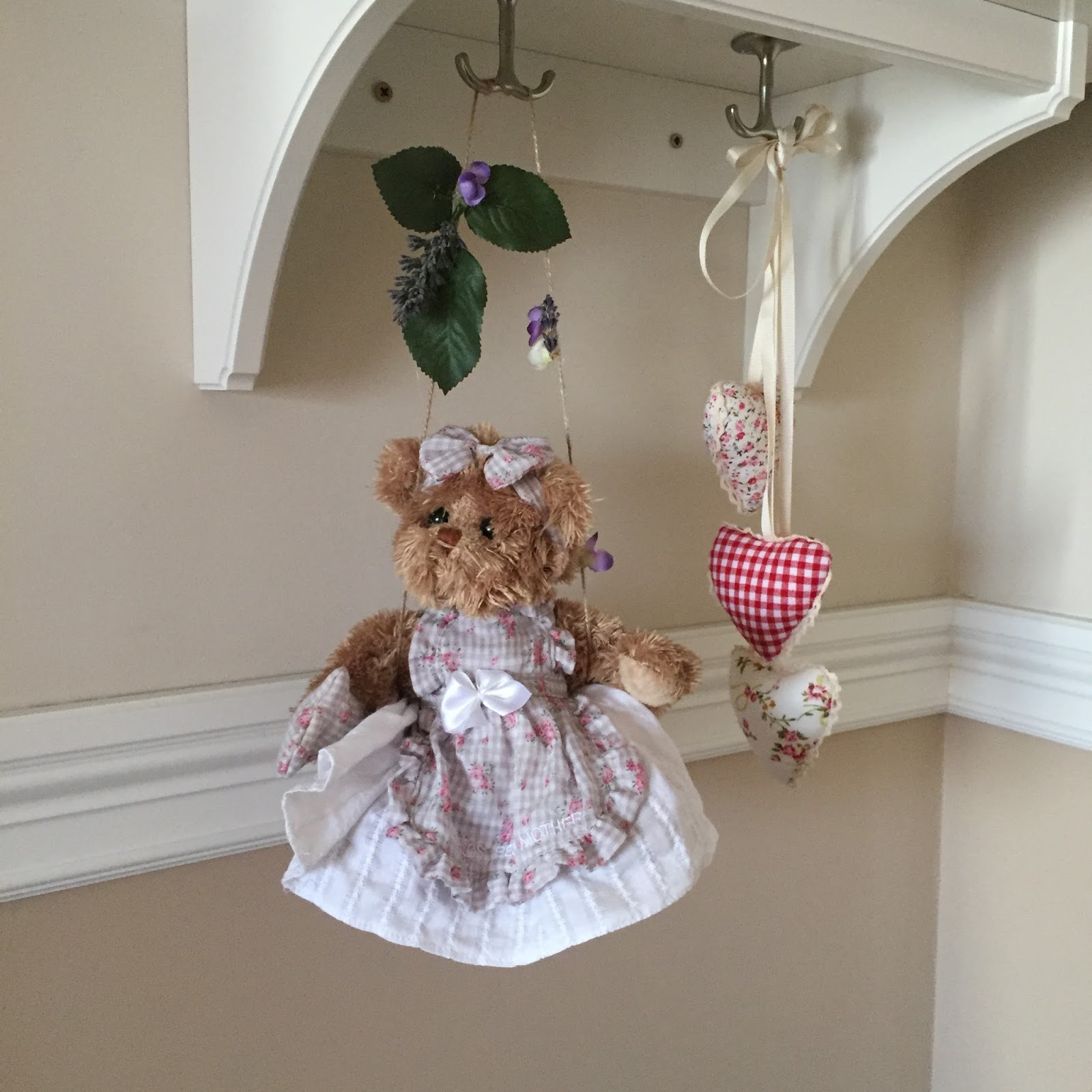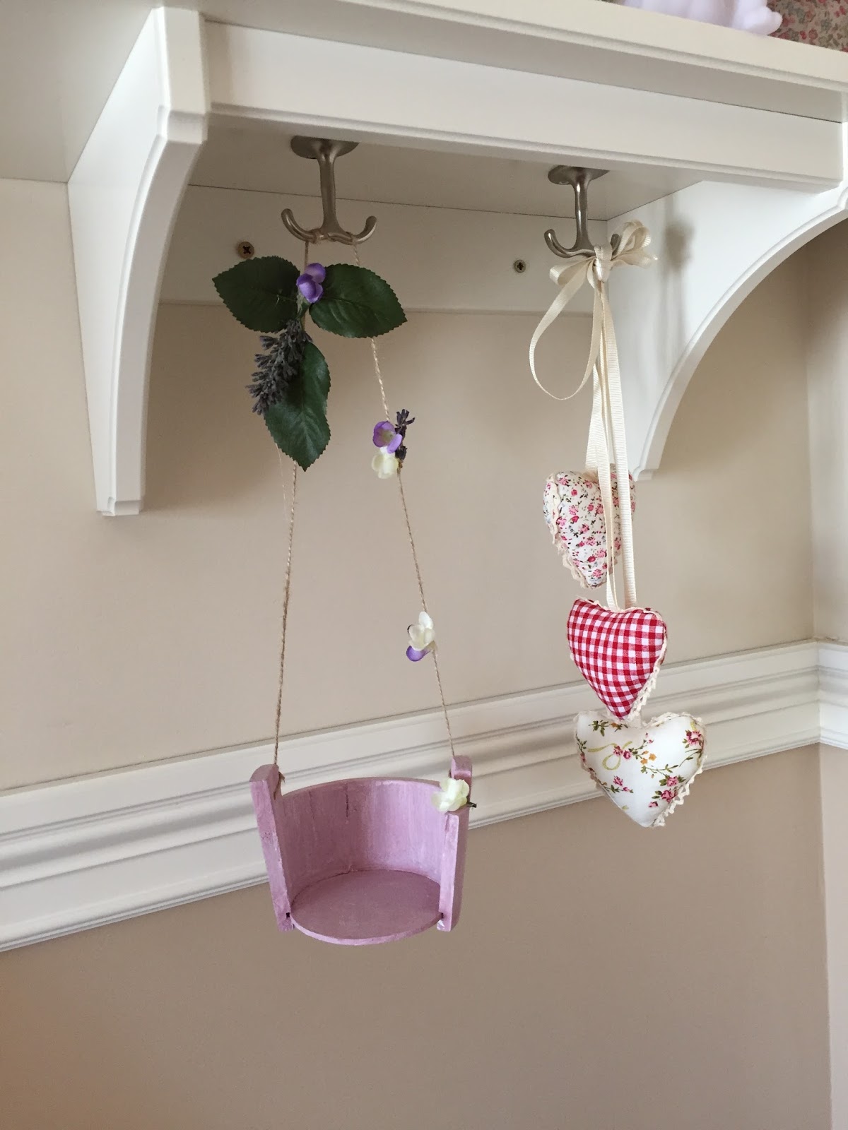 Até la cuerda y con la silicona pegué algunas flores y hojas para darle un estilo más romántico al conjunto y que así fuese acorde con La Habitación de Alexandra.