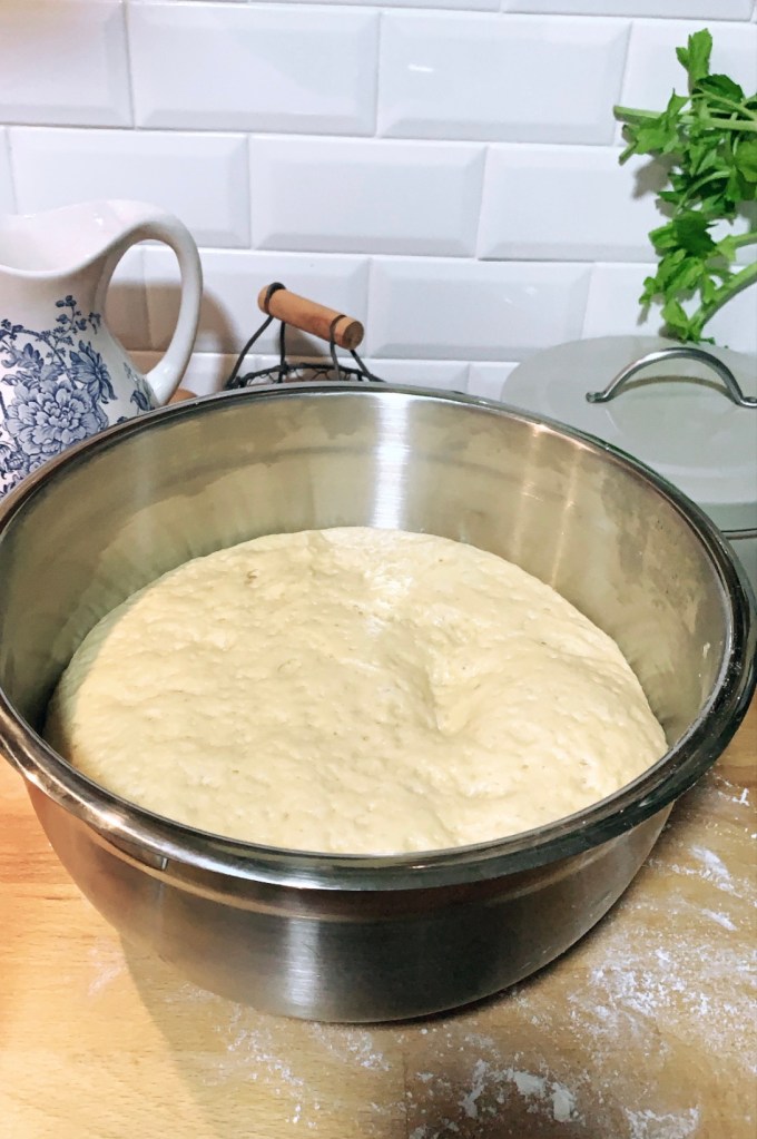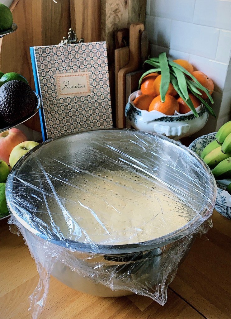 - Poner la masa en un bol grande (tened en cuenta que duplicará su tamaño), cubrir con papel film o con un trapo y dejar reposar a temperatura ambiente (templado).