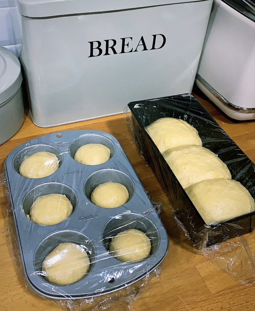 - Colocar las bolas en los moldes (una junto a otra en el caso de los moldes grandes) y cubrir con un trapo. Dejar reposar toda la noche en un lugar templado. Pasado el tiempo de reposo las bolas habrán doblado su tamaño. y quedado pegadas entre sí.